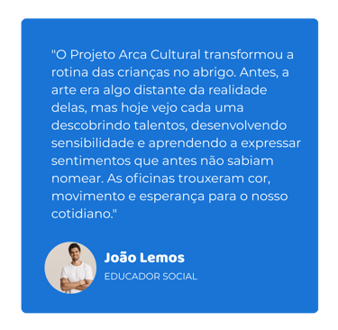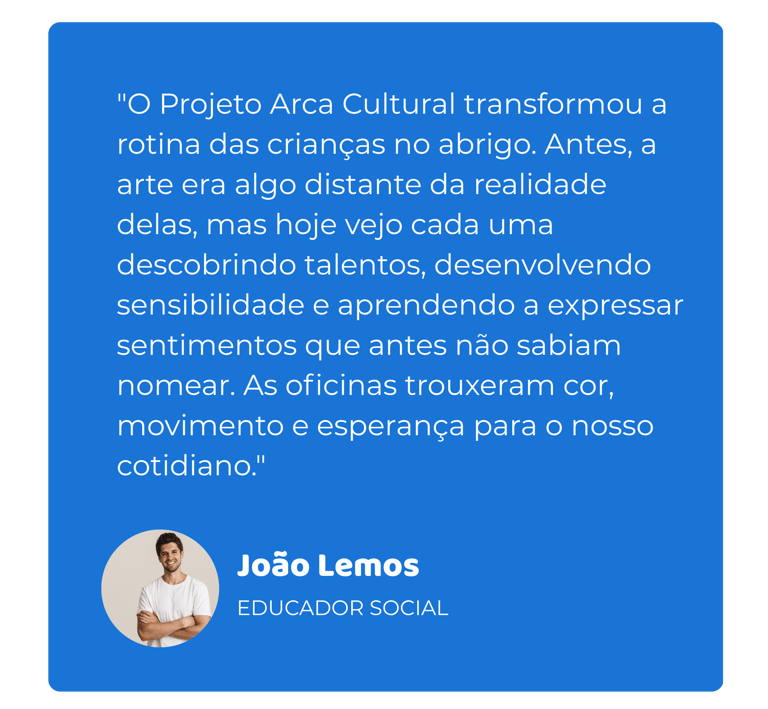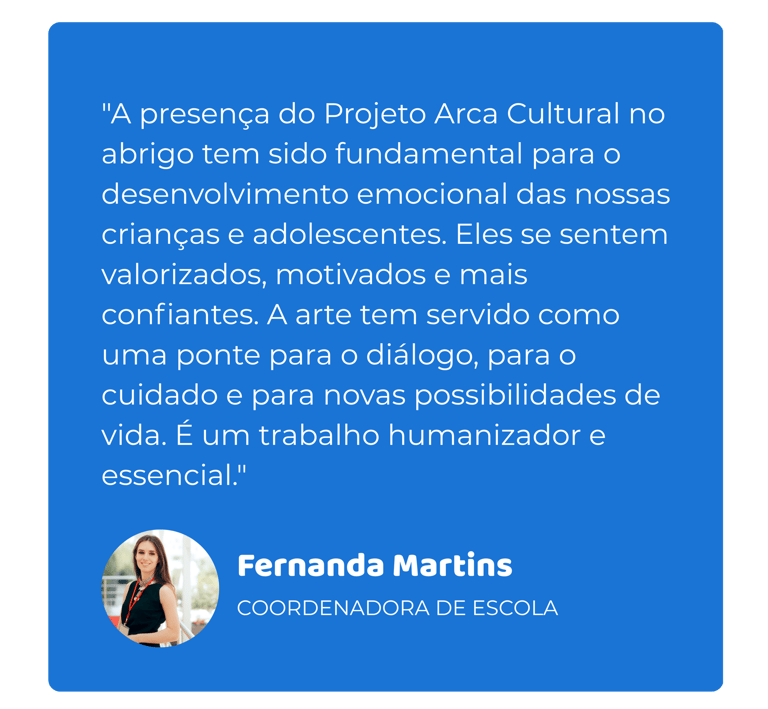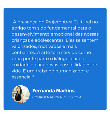 O Projeto Arca Cultural busca democratizar o acesso à arte e cultura para crianças e adolescentes em acolhimento institucional, criando ambientes culturais nos abrigos e oferecendo oficinas, palestras e atividades formativas que estimulam o desenvolvimento criativo, emocional e social.