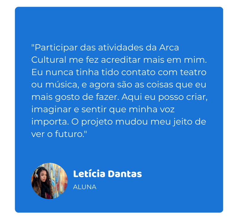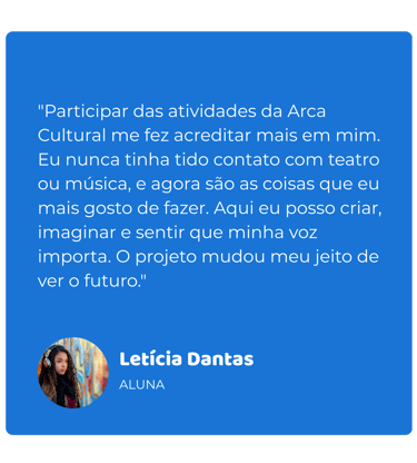 Ao oferecer experiências culturais significativas, o Arca Cultural contribui para a construção de vínculos, o fortalecimento da autoestima e a formação de sujeitos mais críticos, sensíveis e preparados para o exercício pleno da cidadania. Arte é a expressão humana que utiliza diferentes linguagens para comunicar ideias, emoções, percepções e visões de mundo. Ela pode ter função estética, cultural, social ou política, sendo um meio de reflexão, criatividade e conexão entre pessoas e culturas ao longo da história.